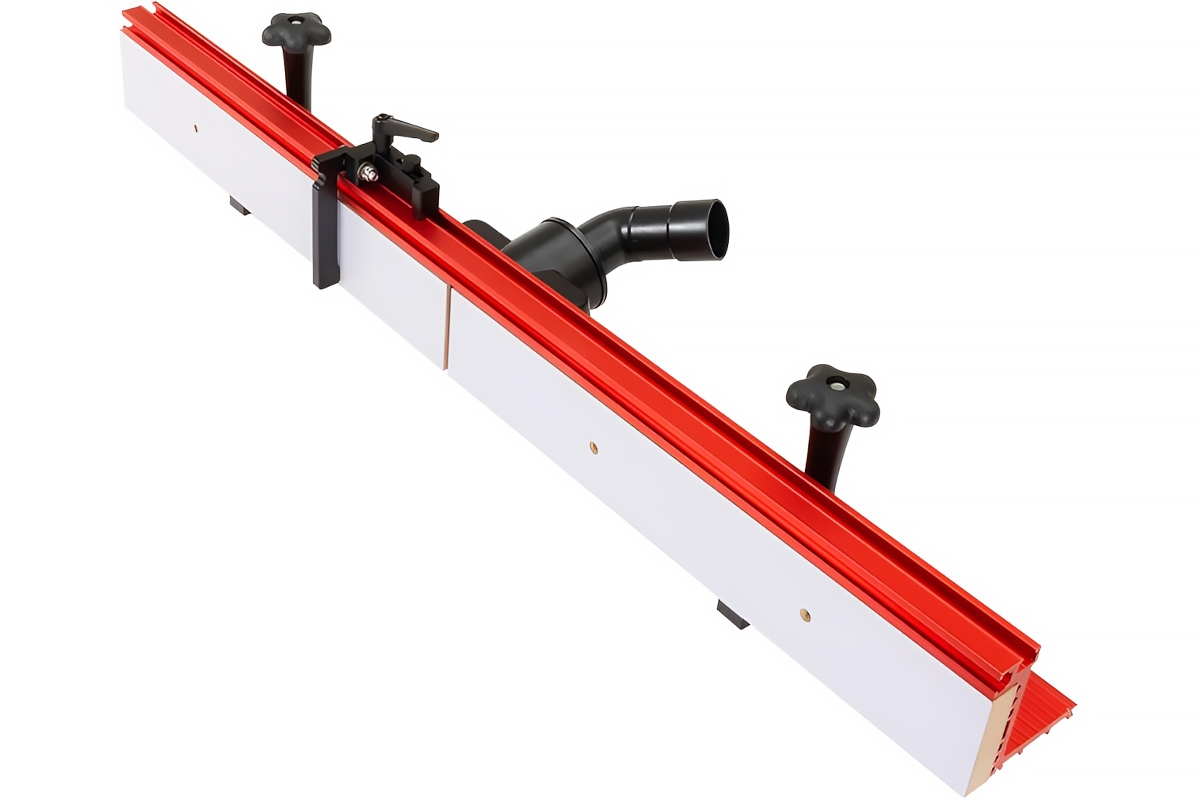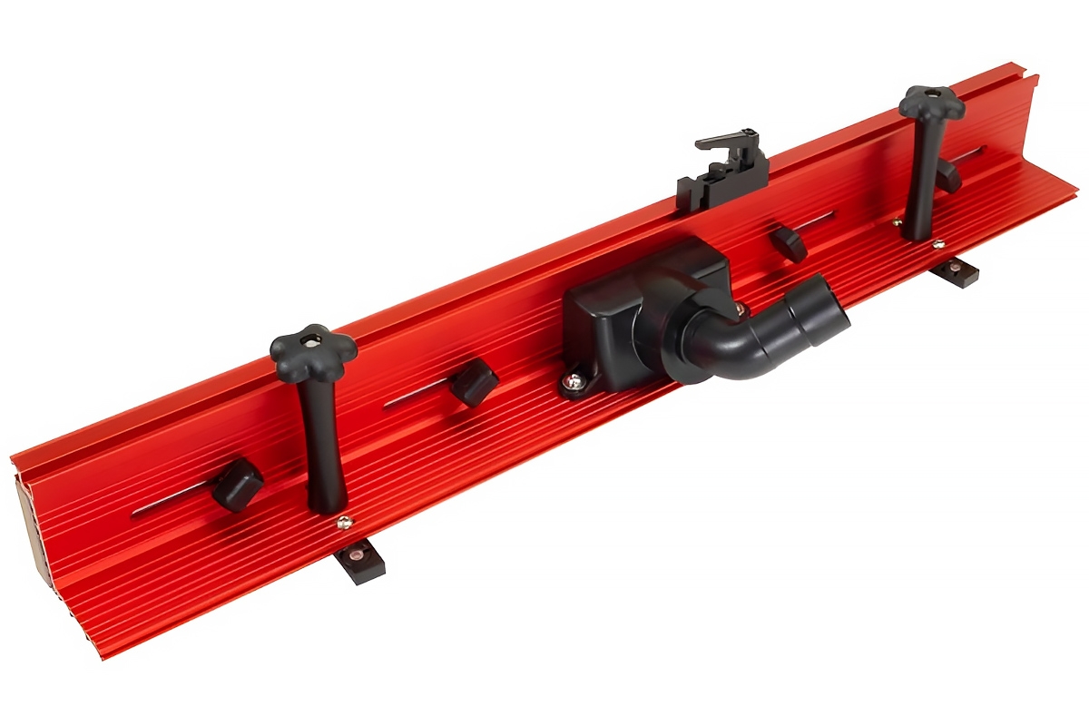 Сердцем системы можно считать параллельный (продольный) упор из прочного алюминиевого профиля, который передвигается по встроенным в столешницу Т-образным алюминиевым профилям с метрическими размерными шкалами с возможностью настройки прямого угла.