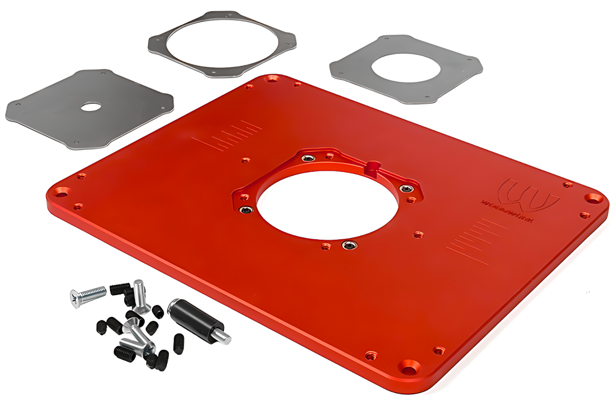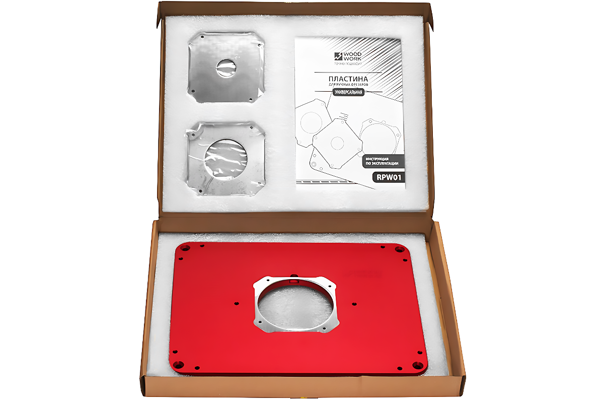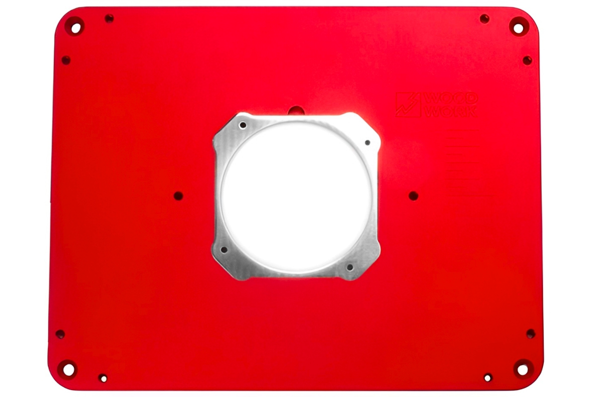 Пластина оснащена десятью регулировочными винтами по периметру для надёжной установки «заподлицо» с верхней плоскостью столешницы фрезерного стола с помощью шестигранного ключа.
