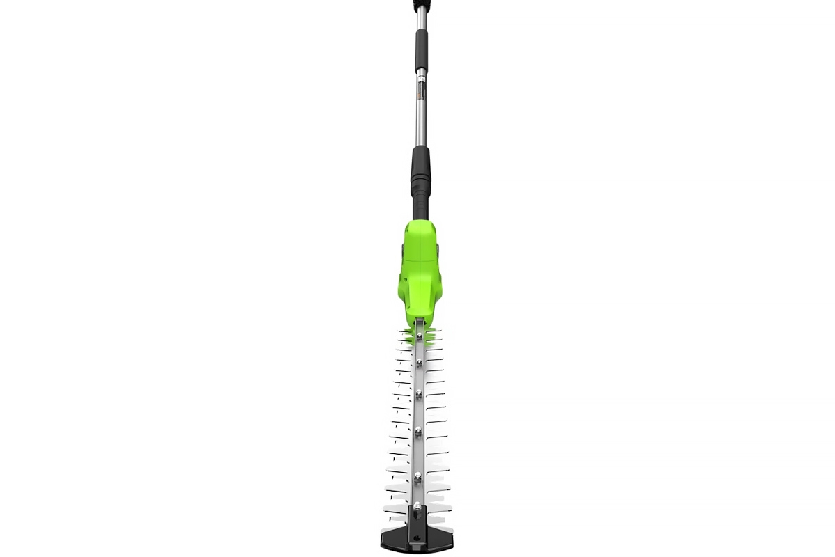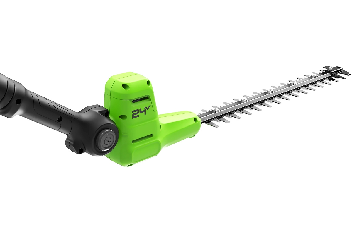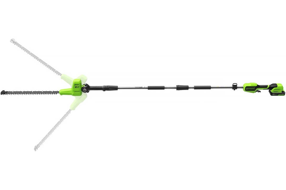Режущая часть поворачивается на 112 градусов и имеет 6 фиксированных положений, что позволяет формировать крону растений не только по фронту, но и в горизонтальной плоскости - сверху.