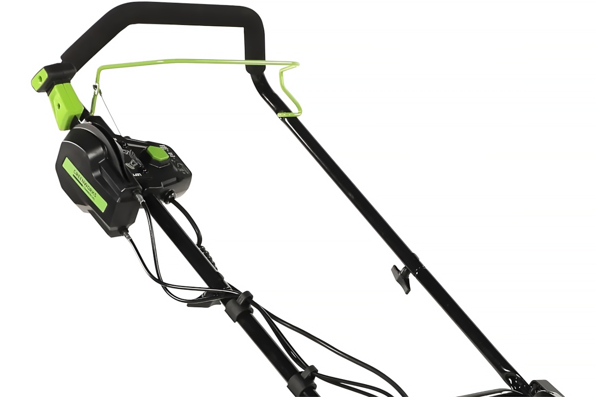 Для безопасного включения предусмотрена кнопка-предохранитель, как и на всей аккумуляторной технике Greenworks.