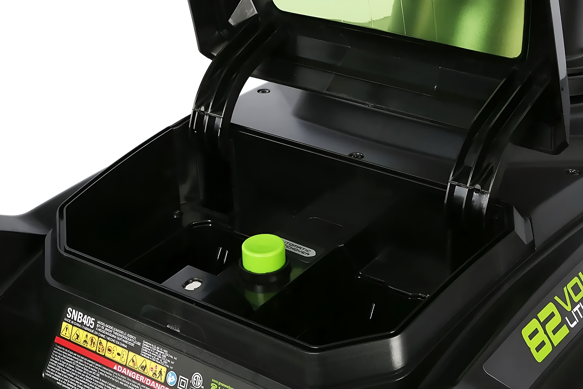 Снегоочиститель оснащен двумя слотами для аккумулятора, один из которых предусмотрен в качестве запасного места для батареи.